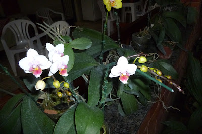 | As Phalaenopsis aqui se encontram na prateleira da esquerda e em um cachepot pendurado mais na parte interna. |