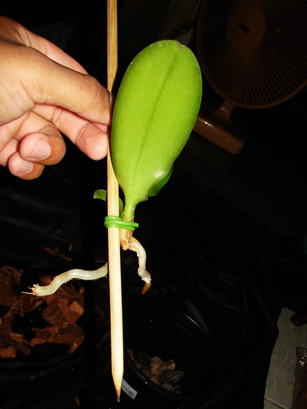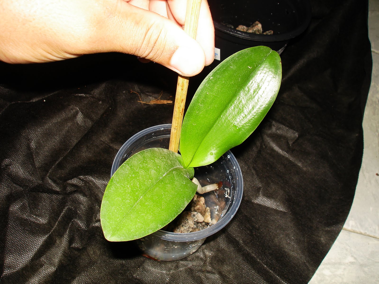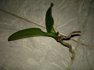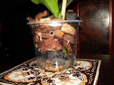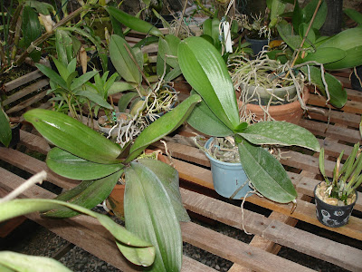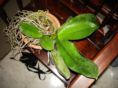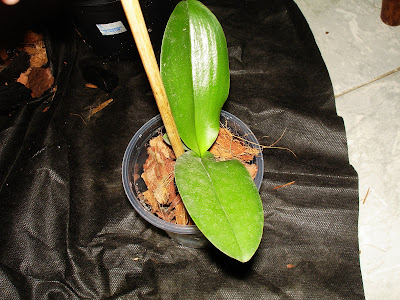 Depois desses 3 tratos principais outro importante é em relação ao replante, pois as Phalaenopsis são um pouco mais exigentes em relação a outros gêneros em relação ao Ph do substrato e em geral elas não toleram bem um substrato muito ácido, e assim aceitam até um replante anual, em vez de ser de 2 a 3 anos como na maioria e quanto a época de replante, este sempre deve ser nos períodos de desenvolvimento vegetativo da planta, quando estiverem emitindo folhas e raízes novas, sendo uma das melhores épocas o período do verão por volta de Janeiro, onde a planta se encontra em seu ótimo de desenvolvimento. Quanto ao substrato em geral elas aceitam diversos tipos de substratos, atentando para substratos de maior espessura, pois como suas raízes são de grande calibre necessitam de uma grande aeração e para facilitar sua fixação no substrato pedaços mais grosseiros dão melhor resultado. Os substratos que são bem satisfatório para o cultivo em geral são os mix de casca de pinus+carvão+chips de coco e podendo acrescentar brita 1 também. Quanto aos recipientes como as Phalaenopsis não possuem rizomas, nem pseudobulbos, possuindo crescimento monopodial e seu caule ganhando espessura muito lentamente os recipientes em geral não precisam variar tanto de tamanho, assim como seria com uma simpodial. Elas aceitam todos os tipos de recipientes, sendo em cachepot onde elas ficam esteticamente mais bonitas, porém os vasos de plástico são os mais fáceis para se cultiva-las, sendo os transparentes os ideais devido as suas grossas raízes exigentes, entretanto isso não é motivo para pânico, já que nem sempre é fácil conseguir estes vasos, pois elas são cultivadas facilmente em vasos de outras cores sem prejuízos notáveis para as raízes. Quanto ao replante é importante atenta para não enterrar demais a planta no substrato e fazer o tutoramento para que ela fique firme no vaso, evitando assim problemas no enraizamento e até a morte da planta(ver postagens sobre tutoramento). Segue agora fotos demonstrando um replante de um keike "desmamado" de Phalaenopsis: