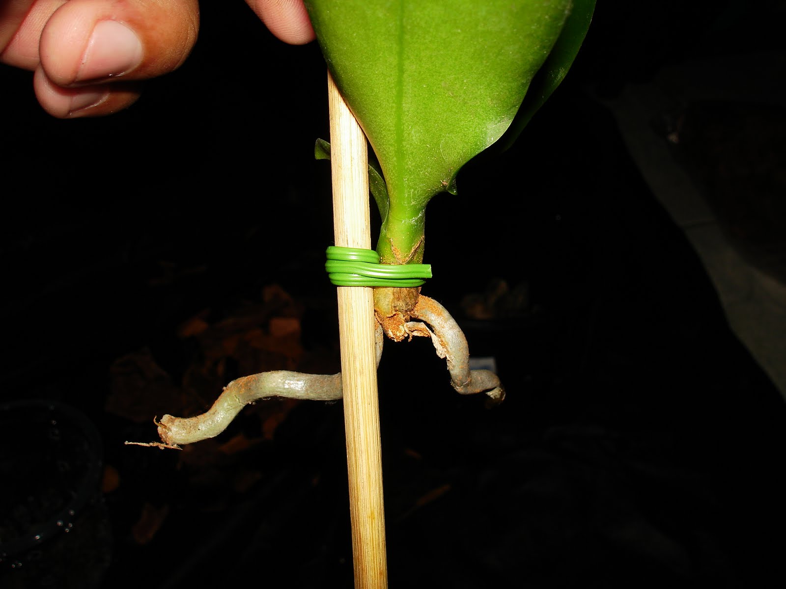 | detalhe da Phalaenopsis presa ao tutor já deixando na altura adequada do vaso |