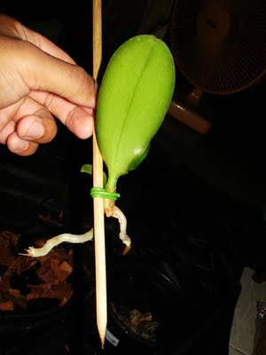 Phalaenopsis entouceirada naturalmente a partir de keikes emitidos de gemas laterais da base das folhas. |