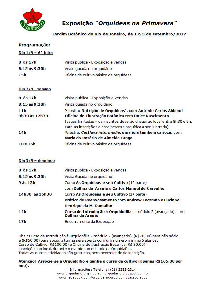 Olá Pessoal!! Venho aqui agora para falar para vocês de mais uma exposição maravilhosa no Jardim Botânico do Rio de Janeiro, que ocorrerá entre os dias 1 e 3 de Setembro. Como sempre digo será mais uma grande oportunidade para apreciarem nossas belas orquídeas, além de poder adquirir e aprender um pouco mais sobre esse magnifico mundo das orquídeas e nesta edição será homenageada a Cattleya intermedia, que também ocorre na Nossa cidade maravilhosa e nosso Estado maravilhoso e tão mal tratado que é o Rio de Janeiro. Vejam mais detalhes no cartaz da exposição e na programação que segue logo abaixo. Forte abraço a todos e até a próxima pessoal!!